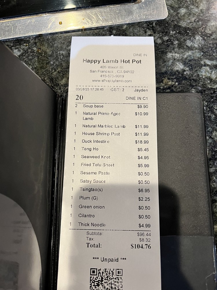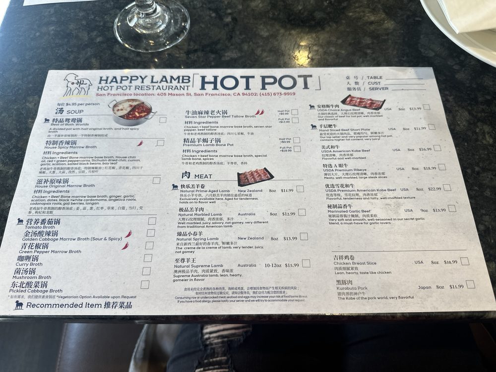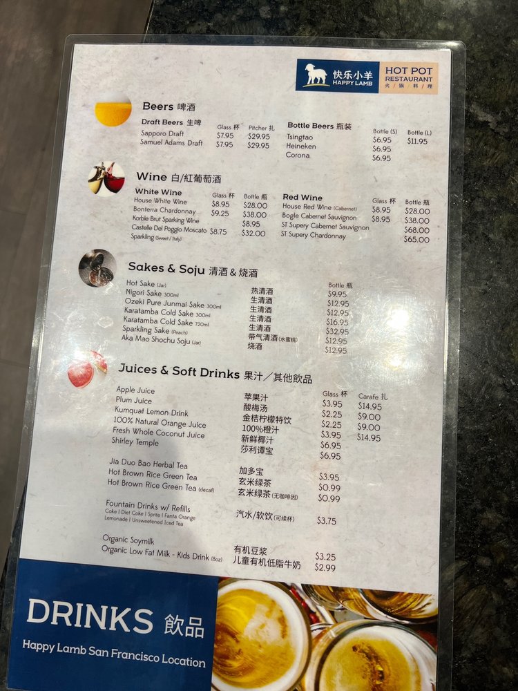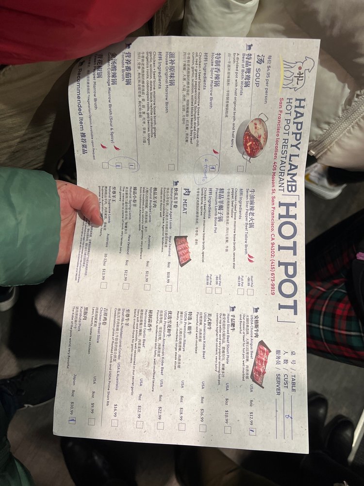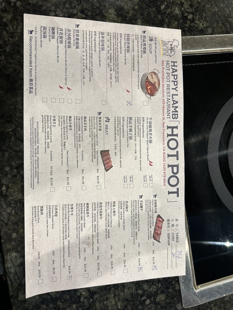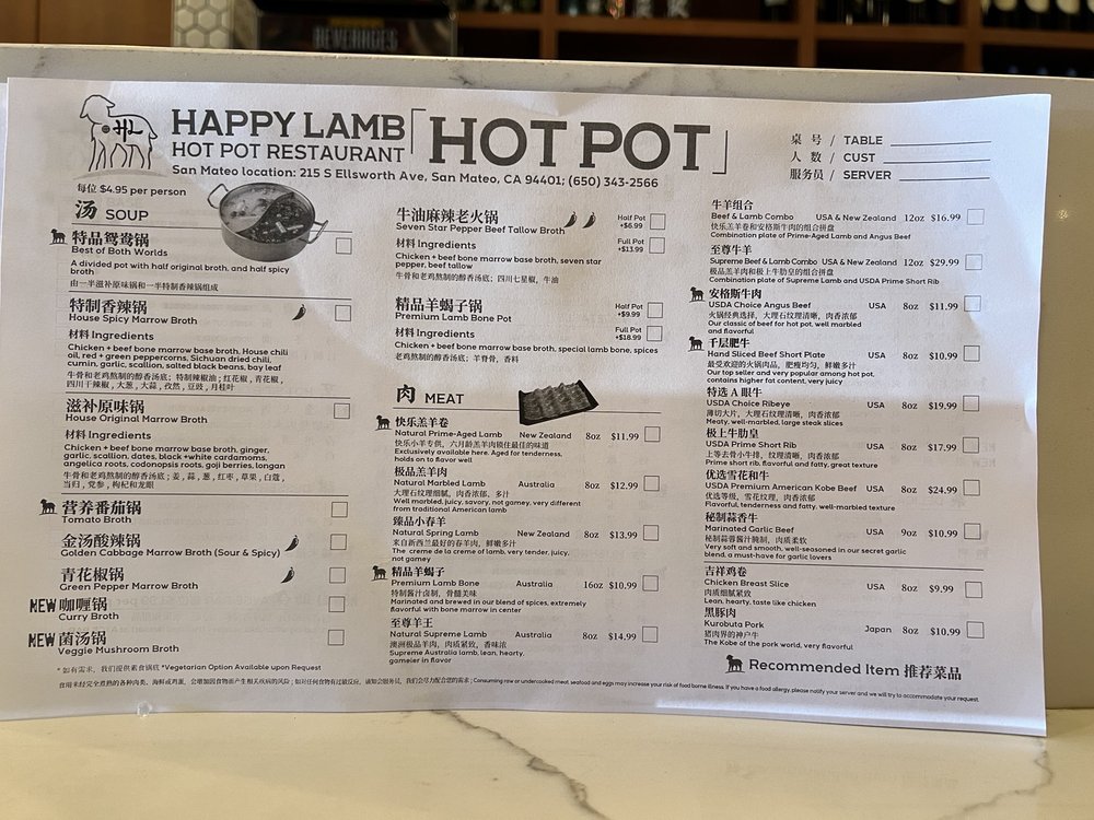 Introducing Happy Lamb Hot Pot, a popular restaurant in San Francisco offering a variety of hot pot options. With a focus on high-quality meats like Natural Spring Lamb and Natural Prime-Aged Lamb, this eatery provides a unique dining experience. Customers praise the fresh ingredients, endless sauce options, and attentive service. The menu also includes delicious soup bases such as the Original Marrow Broth and Spicy Marrow Broth, as well as cold dishes like Kimchi and Spicy Lamb Tripe. The restaurant's convenient location and amenities like free Wi-Fi and street parking make it a great choice for groups or families. Happy Lamb Hot Pot has garnered rave reviews for its flavorful dishes and cozy atmosphere, making it a must-visit spot for hot pot enthusiasts.