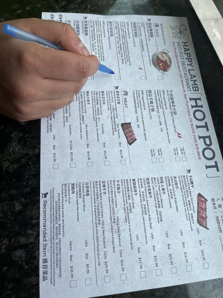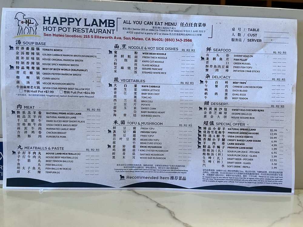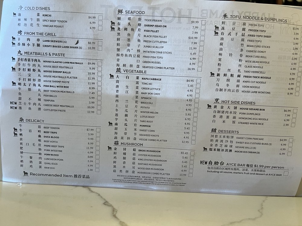 Half&Half Broth: Original & SpicyMeat:Natural Spring Lamb, Natural Prime-Age Lamb, USDA Choice Angus Beef, Hand Slice Beef Short PlateMeatballs: Lamb, Beef, Shrimp, FishDelicacy: Beef Tendon, Quail Egg, imitation crab sticks, beef tripeSeafood: Shell-less tiger prawns, Fish fillet, Green mussels, ScallopsVegetables: Broccoli, potato, pumpkin & 2 daily greensNoodles: Fresh thick Noodle, House Special Wide bean NoodleDesserts: Golden fried sesame balls w/ Red Bean PasteDrinks: Organic Fresh Apple Juice, Fresh Plum Juice