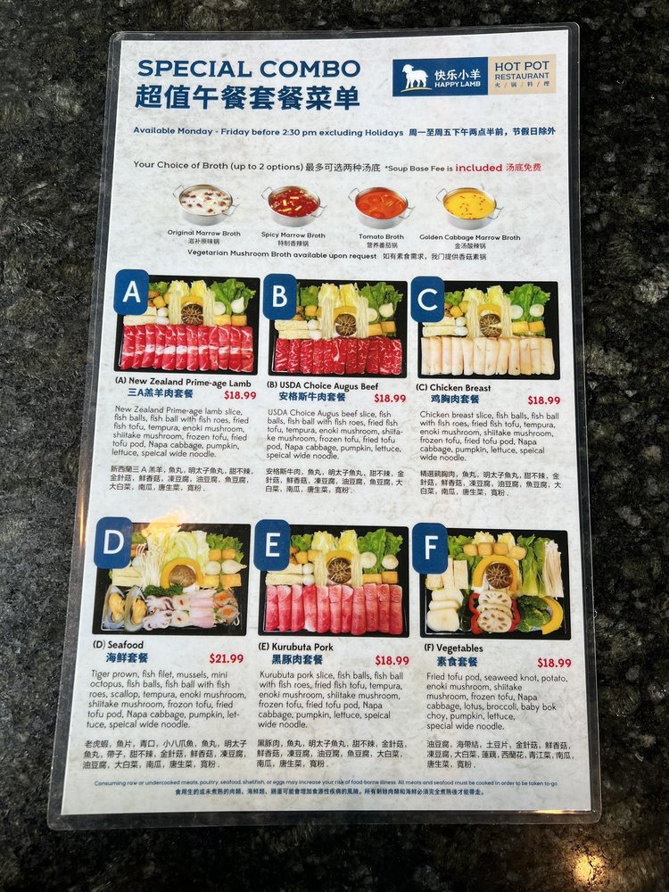 Half&Half Broth: Original& SpicyMeat Combo : Natural Spring Lamb, USDA Angus BeefMeatball Platter: Lamb, Beef, Shrimp, FishDelicacy Platter: imitation crab sticks, Beef Tripe, Lamb Tripe Stick, Pork IntestineSeafood Combo: Shell-less tiger Prawn with fish roe, Fish filletVeggie Platter: Broccoli, potato, Pumpkin & (2 daily greens)Noodle: Fresh Thick Noodle Desserts: Fried Golden sesame balls with red bean paste